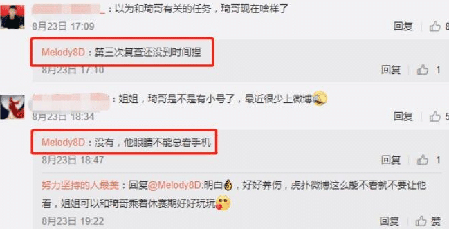 周琦是有伤病的,他的爱人在社交媒体上与球迷们互动,谈到了周琦的眼睛,称“第三次复查还没到时间。他眼睛不能总看手机。”
