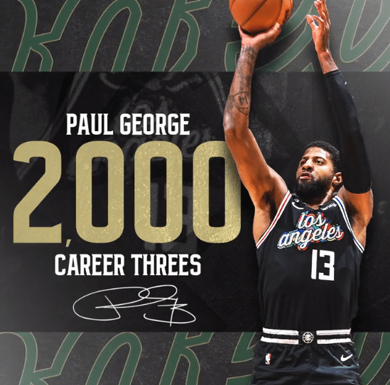 乔治也迎来里程碑,第二节命中不讲理三分,生涯三分命中数正式达成2000记大关,成为NBA历史上第14位达成如此成就的球员;乔治也成为快船队史贾巴尔-克劳福德后第二位命中2000+三分的球员。