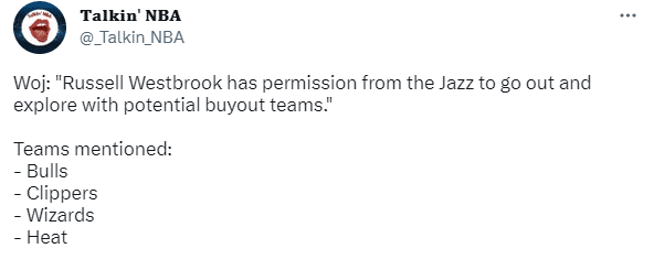 woj则报道,快船、奇才、公牛和热火是威少潜在下家,威少已获准与别队会面谈判。还补充报道,有一种可能性存在,那就是即便威少没球打,他休赛期在自由市场上仍然会有市场,因为他这赛季在湖人打得很好。
