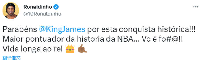 随后,巴西传奇球星罗纳尔迪尼奥在个人社交媒体上,向詹姆斯表达了祝贺。