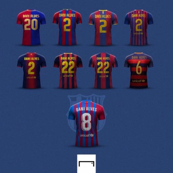 阿尔维斯在效力巴萨期间曾身披多个号码,最初他穿20号,然后是2号,也穿过22号和哈维离队后留下的6号球衣。