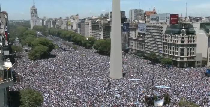 阿根廷此前在世界杯决赛中击败法国,夺得冠军,北京时间昨晚,球队回到布宜诺斯艾利斯举行夺冠游行庆祝,400万名球迷参加了活动,方尖碑周围挤满了人。