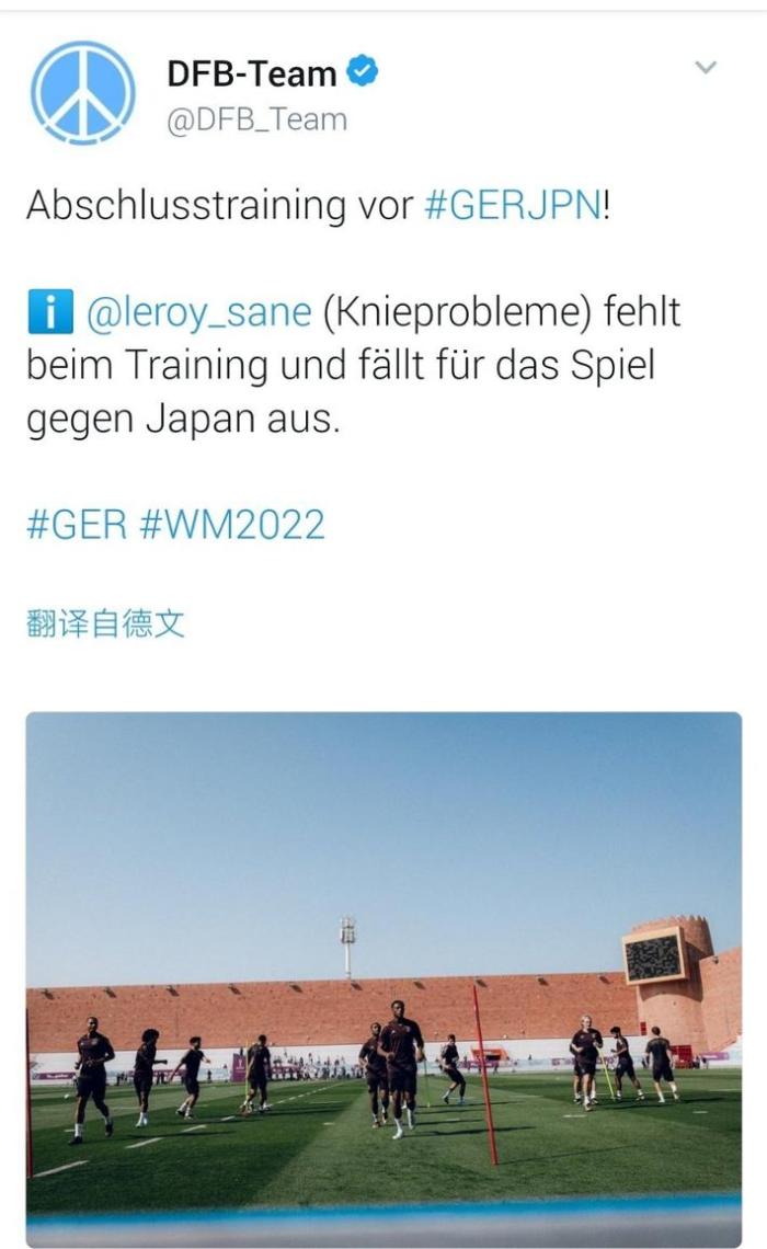 德国队官方消息,萨内因为膝盖问题缺席今日训练,球员也将缺席对阵日本的比赛。