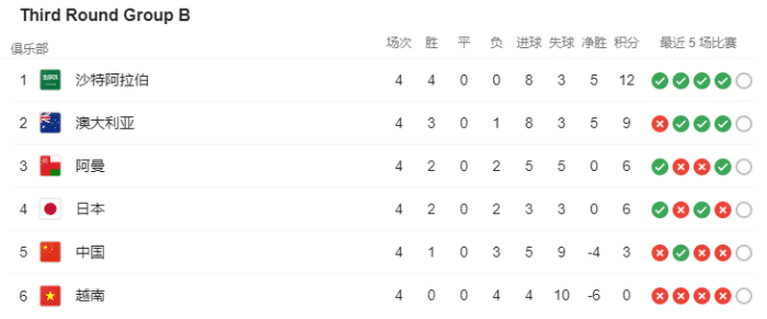 12强赛B组有6支球队,沙特12分第一,澳大利亚9分第二,阿曼和日本同积6分,分列三四位,国足3分第五,越南0分垫底。