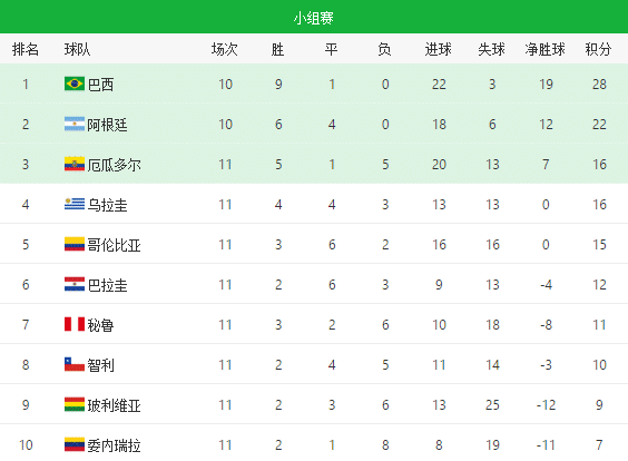 世预赛南美区排名!巴西全胜被终结,阿根廷不败,榜尾三队逆袭