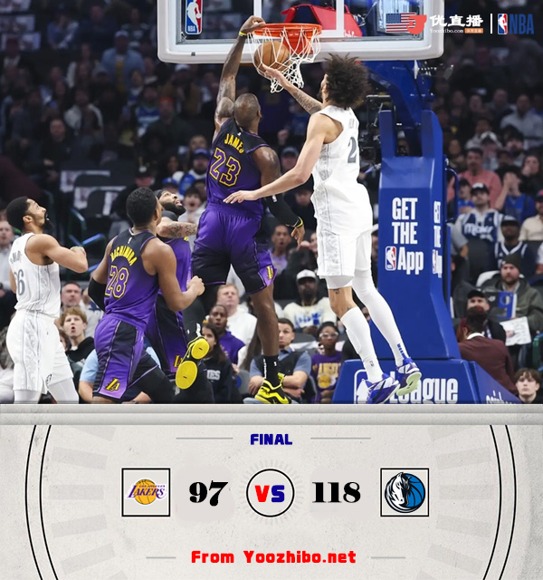 925直播讯 北京时间1月8日讯 NBA常规赛,湖人对阵独行侠,湖人上场比赛惜败火箭,独行侠最近因为东欧的受伤遭遇5连败,本场比赛东契奇和欧文继续缺阵。开场后丁威迪和华盛顿轮番拿分帮助独行侠取得领先,詹姆斯和戴维斯轮番冲击内线帮助湖人扳回局面,格莱姆斯替补登场后状态火热连连拿分,凭借詹姆斯一记强势三分,湖人首节领先3分。第二节前半节两队依旧打得十分胶着,克里斯蒂连得7分帮助湖人稍稍将分差拉大,但克莱连续三记三分还以颜色帮助独行侠以5分优势结束上半场。易边再战,詹姆斯和戴维斯轮番发力追分,但丁威迪和华盛顿俩人状态神勇帮助独行侠始终保持优势,随后独行侠一阵三分雨将分差拉大到两位数,最后一节湖人依旧努力追分,克内克特连中三分,詹姆斯也努力冲击内线,但独行侠始终能够及时回应,在第四节最后阶段湖人连续进攻不中,比赛失去悬念,最终独行侠118-97击败湖人结束5连败,湖人遭遇2连败。