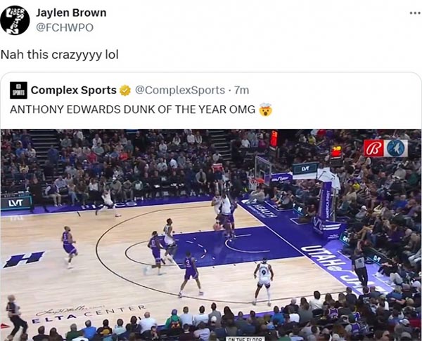 爱德华兹死亡隔扣科林斯引热议,名记凯文-奥康纳发推表示这是年度最佳扣篮;美媒刷屏转发并直呼:我的天呐;凯尔特人球星杰伦-布朗发推高呼:哇塞这也太疯狂了哈哈。