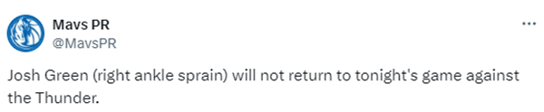 在独行侠和雷霆比赛进行到第一节4分12秒时,约什-格林在反击时踩到了莱夫利的脚,导致自己的脚踝呈90度扭伤,严重崴脚后痛苦倒地,痛苦捶地十分难受,之后一瘸一拐离场;在更衣室中接受检查后,独行侠官方宣布,约什-格林因右脚踝扭伤,本场比赛不会回归。