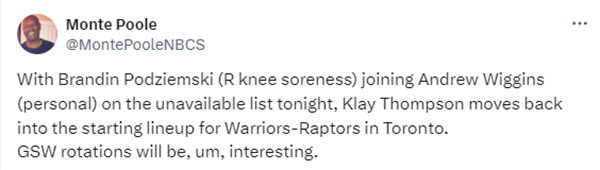 勇士飞往多伦多的飞机因飞机机械故障而延误;今日客场背靠背对阵猛龙,维金斯继续缺战,波杰姆斯基因右膝酸痛也无法出战,因此勇士再次变阵,克莱重返首发;值得一提的是,过去6场比赛,克莱全队替补出战,勇士5胜1负。