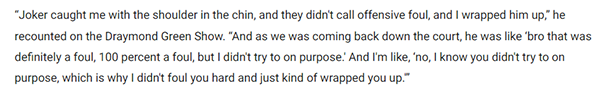 末节追梦不满约基奇推开自己而抱人犯规,赛后追梦在播客中谈及这个争议判罚,他表示:约基奇抓住了我的肩膀和下巴,裁判没有吹罚犯规,我直接抱住了他;当我们回到球场时,他说“兄弟,那绝对是犯规,100%是犯规,但我不是故意的”,我说“我知道你不是故意的,这就是为什么我没有对你凶狠犯规,只是抱住了你。”