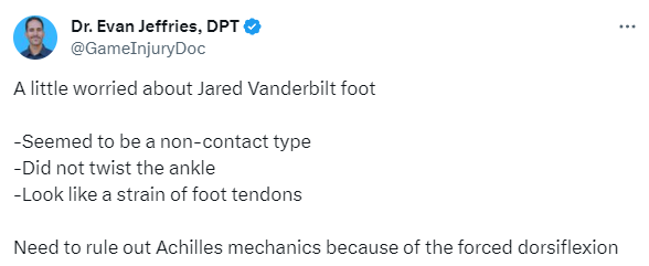 医学专家Evan Jeffries表示有点担心范德彪的脚伤,好像是非接触式受伤,没有扭伤脚踝,看起来像是脚的肌腱拉伤。