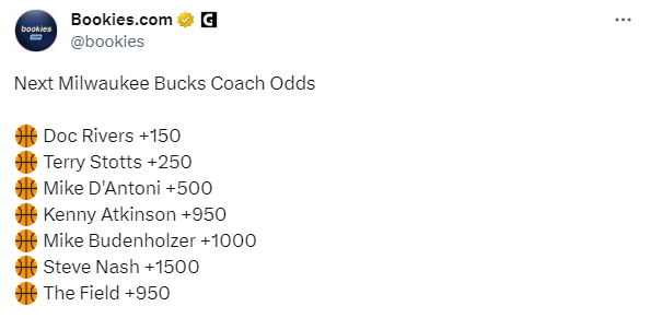 老里弗斯有望成为雄鹿新帅,在雄鹿新帅赔率榜上,里弗斯领跑——具体赔率为1、里弗斯 +150;2、斯托茨 +250;3、德安东尼 +500;4、阿特金森 +950;5、布登霍尔泽 +1000;6、纳什 +1500