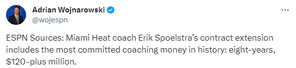 热火已经和53岁主教练斯波尔斯特拉提前续约,据热火记者Tim Reynolds报道,斯波和热火提前续签一份8年长约,本赛季是他原合同的最后一年;热火另一记者Ira Winderman报道,斯波新合同年薪超过1000万美元;之后名记woj进一步报道,斯波合同8年超过1.2亿美元。