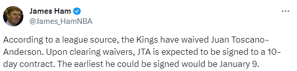 据国王随队记者James Ham报道,国王已裁掉了托斯卡诺-安德森;在安德森度过豁免期后预计会与国王签下一份十天短合同,最早他可以在1月10日与国王重新签约。