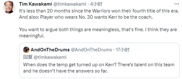 当被问及球队目前的更衣室气氛,Tim Kawakami回复道:“我没听说有任何问题,相比本赛季,由于一些大家都知道的原因,上赛季的情况显然要奇怪得多。勇士本赛季只是没有赢太多比赛,这让人有些沮丧,也许有些球员更倾向于自我调节。但总体来说,化学反应似乎还不错。”