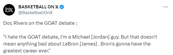 近日,前NBA主帅、现评论员道格-里弗斯在节目中表示乔丹是GOAT人,但詹姆斯也拥有伟大的生涯;当时老里表示:我讨厌有关谁才是GOAT的争论,我是乔丹派的,但这并不意味着詹姆斯不好,詹姆斯将拥有有史以来最伟大的职业生涯,这是毫无疑问的,一段GOAT的生涯。如果要我只选一个,我会选乔丹,那这没有任何贬低詹姆斯的意思。我不理解的是,为什么很多人都要捧一踩一,他们俩都非常非常棒。每一代人都有自己心中的GOAT,我爸还认为比尔-拉塞尔是GOAT呢。我儿子一直喜欢詹姆斯,认为他更棒,我当时还给他了一卷乔丹的录像,他两周后敷衍地回答我,‘行了,老爸,乔丹最好。’”