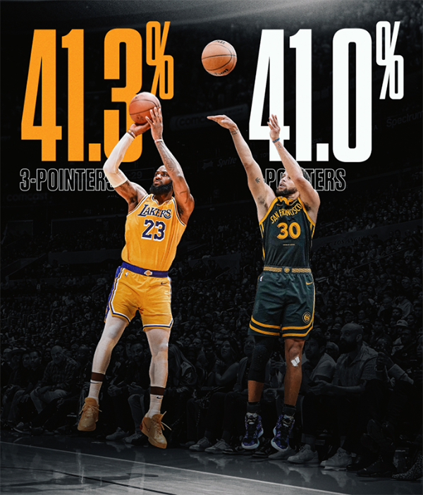 赛季至今,詹姆斯场均拿到25.1分7.6篮板7.4助攻1.4抢断以及0.7盖帽,投篮命中率53.9%,三分命中率41.3%创生涯新高,值得一提的是,本赛季詹姆斯的三分命中率比库里(三分命中率41%)的略高一点。