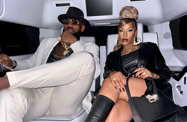 詹姆斯身穿一套白色礼服和黑色衬衫,戴着帽子墨镜和“狮王”造型的戒指,脖子和手腕上都戴着大金链子,穿金戴钻太土豪;萨瓦娜身穿性感皮衣和长筒靴,同样戴着很多名贵手势,发型十分抢镜;詹姆斯夫妇恩爱合影,老詹露出歪嘴的霸气表情。