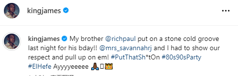 今日詹姆斯更新社交媒体,晒出自己携妻盛装参加里奇-保罗42岁生日派对的帅照,配文写道:我兄弟里奇-保罗昨晚在生日派对上表现得十分冷酷,我和萨瓦娜不得不表示尊重并且停下来。