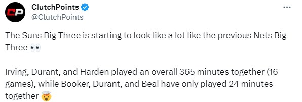 太阳三巨头太惨了,美媒CLutchPoints发推表示太阳三巨头看起来太像篮网三巨头——篮网三巨头杜兰特、欧文和哈登一起出战16场比赛,共同在场365分钟,占期间球队总比赛时间的4%;太阳三巨头至今共联手出战24分钟,占期间球队总比赛时间的2%。