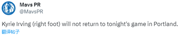 欧文的伤势令人担忧,希望他的右脚伤势无大碍;赛季至今,欧文已经为独行侠出战17场比赛,场均贡献23.8分5.4助攻4.1篮板。