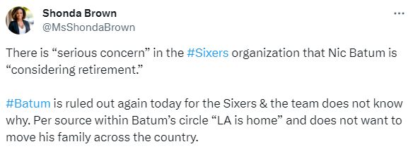 如今美记爆料巴图姆可能考虑退役,因为他视洛杉矶为家,不想举家搬迁到费城;本赛季,巴图姆为快船打了3场比赛,被交易后缺席至今且因个人原因离开76人。