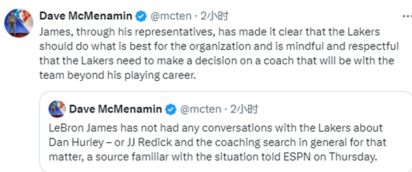 据悉,詹姆斯建议湖人为浓眉而聘请新的主教练,而不是为了他。据湖人记者Dave McMenamin报道,一位知情人士透露,詹姆斯并未与湖人就丹-赫尔利或JJ-雷迪克相关的选帅事宜进行任何交流;詹姆斯通过其代表明确表示,湖人应做对球队最有利的事情,并且他理解和尊重湖人需要决定一位将在他职业生涯结束后继续带队的教练。