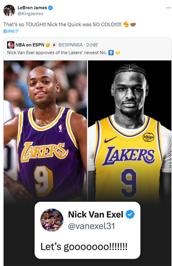 湖人名宿埃克塞尔力挺布朗尼选9号,发推写道:让我们加油!!!随后老詹发推为儿子感谢埃克塞尔,直言:尼克太酷了。