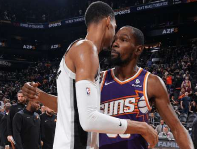 据统计,在马刺再次击败太阳的最后4分15秒,文班亚马4中4,得到10分,而太阳整队10投仅1中,得到5分;文班一个人打崩太阳全队;赛后文班亚马和杜兰特拥抱,KD被逗笑后推了一下文班,笑着离场。