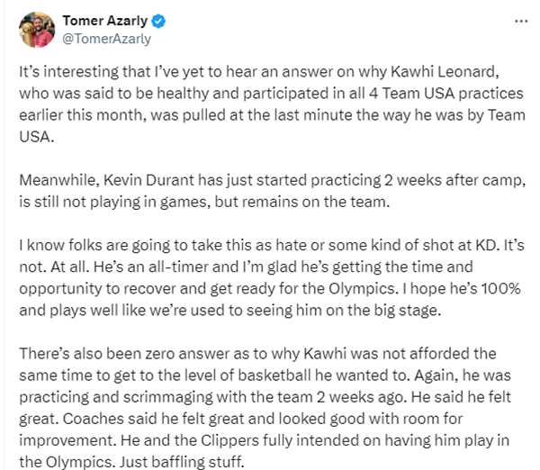 对于杜兰特一直受伤仍留在美国队,小卡参加训练却被换掉,快船记者Tomer Azarly发推:我还没有听到关于为什么科怀-伦纳德在最后一刻被美国队撤下的原因,据说他身体健康,并且参加了本月早些时候美国队的全部4次训练。