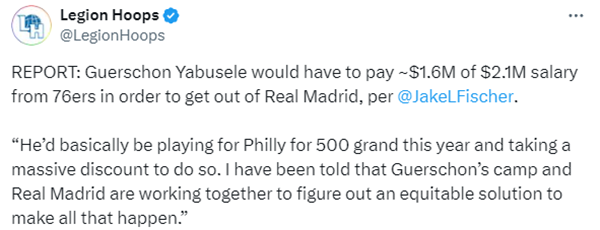 据悉,亚布塞莱与皇马的买断为250万美元,为了回归NBA,亚布塞莱自己付160万美元,76人队则是付90万美元。