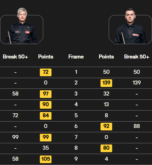 第九局:罗伯逊在第九局中稳住阵脚,打出单杆58分,以105-4的比分终结比赛,最终以6-3战胜塞尔比,成功挺进四强。