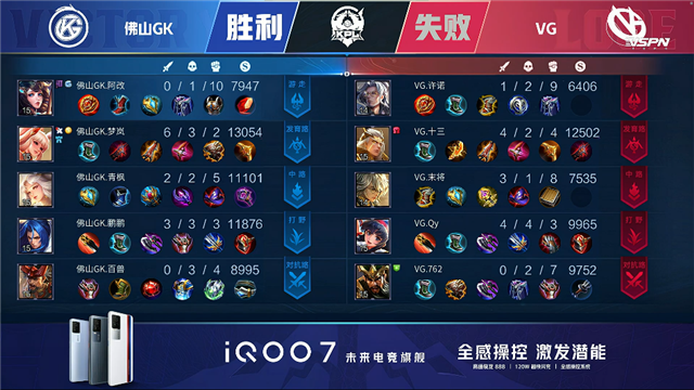 双方和平开局,2分10秒团战VG抢下第一条暴君,打出1换3,3分钟佛山GK上路击杀镜。4分20秒VG下路击杀狄仁杰,4分40秒VG拆掉佛山GK下路一塔,5分51秒VG拆掉佛山GK下路二塔。6分钟中路团战,VG打出0换2,6分34秒VG拆掉佛山GK中路一塔。7分28秒佛山GK上路一塔被破,VG打出0换2,8分51秒佛山GK上路二塔被破。9分10秒上路团VG打出1换3,拆掉佛山GK上路高地,随后带领兵线一波拆掉佛山GK水晶,拿下本局胜利。