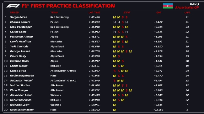 - 【集锦】[F1]2022赛季阿塞拜疆大奖赛一练最快圈 (佩雷兹:1.45.476)2022-06-10 22:48:58