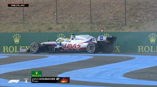 米克·舒马赫的赛车撞上了护墙,角田裕毅的赛车在最后一弯打滑