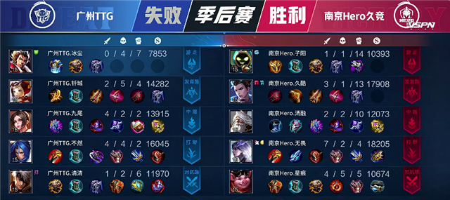 双方和平开局。2分31秒橘右京拿下暴君。3分40秒娜可露露拿下主宰。4分35秒南京Hero久竞推掉中路一塔。6分10秒广州TTG下路一塔被破。6分45秒下河道团战,嬴政拿下一血。7分09秒吕布拿下暴君。8分22秒橘右京拿下主宰。8分45秒上路团战,娜可露露被击杀。10分19秒橘右京拿下主宰。10分35秒下河道团战,周瑜被击杀。10分55秒暴君团,太乙真人被击杀。11分45秒南京Hero久竞强攻下路二塔,嬴政被击杀。12分钟南京Hero久竞推掉下路高地塔和中路二塔。12分15秒中路团战,后羿被击杀。13分40秒广州TTG入侵野区,橘右京被击杀。14分16秒娜可露露拿下暴君。14分50秒后羿拿下主宰。16分20秒南京Hero久竞推掉中路高地塔。18分30秒下河道团战,太乙真人被击杀,后羿拿下暴君。18分50秒南京Hero久竞推掉上路高地塔,顺势一波强攻水晶。19分21秒南京Hero久竞推掉水晶再拿一分。