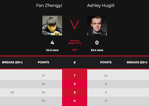 925直播讯 北京时间8月24日晚间及次日凌晨,斯诺克北爱尔兰公开赛资格赛继续进行。范争一对阵阿什利·赫吉尔,首局双方就展开激烈缠斗,范争一率先组织进攻,但是效果不佳。赫吉尔上手之后也没能连续得分,最终范争一还是凭借70-63率先赢得第一局。第二局,双方依然打的很胶着,范争一零敲碎打,获得59分,59-31取得2-0领先。第三局,范争一轰出单杆68分,85-0取得3-0领先,来到赛点。第四局,范争一以58-13赢下对局,4-0大比分淘汰对手,晋级下一轮。