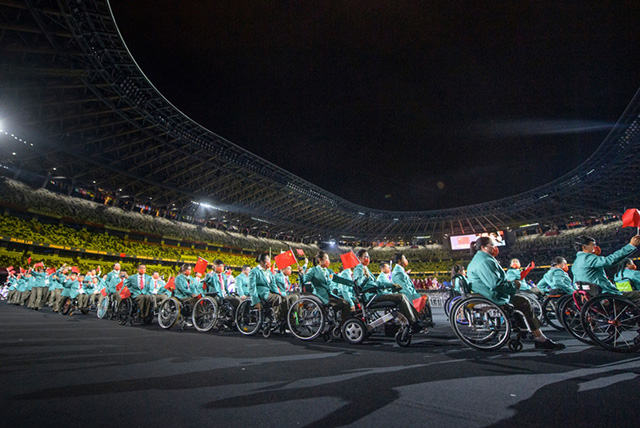 在开幕式第一段表演结束后,运动员入场式正式开始。身穿淡绿色西装礼服的中国代表团,在双旗手——女子轮椅射箭运动员周佳敏和男子肢残田径运动员王浩的引领下,按照日语首字母顺序,排在第98位入场。