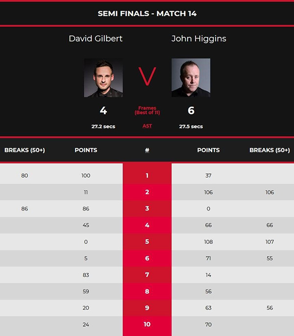 在第九场比赛中,希金斯顶住了吉尔伯特的冲击,一杆获得56分,赢得63-20和5-4赢得比赛点。在第十局中,希金斯先得18分,吉尔伯特有机会获得15分,强行攻击了远端站的红球并犯了一个错误。希金斯在21分之后错过了红球,但是吉尔伯特在9分之后又做出了另一个红球。希金斯拿下23分,以62-59超级得分,最后一个红色进球没有得分。经过几次防守投篮,希金斯又进了一个红色进球,并连续两场比赛以70-24取得6-4的胜利。