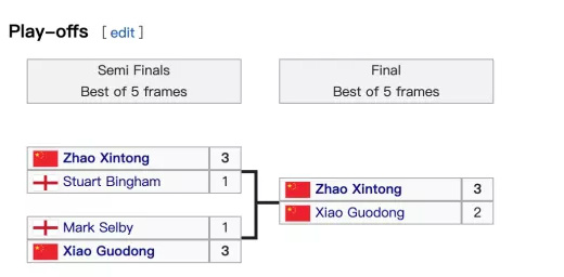 小组赛最后一轮,赵心童又以3-1的比分战胜鲁宁,取得6胜0负的骄人战绩,毫无悬念的排名小组第1。塞尔比、肖国栋和宾汉姆分居第2-4位。鲁宁排名第5,将继续转战第4小组。佩里和瑞恩·戴遭到淘汰。