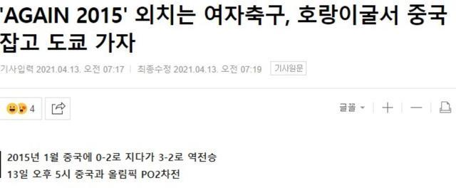 韩国媒体表示,虽然韩国女足现在处境不利,但2015年她们也曾从0-2到3-2逆转,因此这一次逆转也不是不可能。