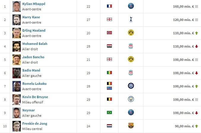925直播讯 今日,德转更新了最新的球员身价榜单,姆巴佩1.6亿欧元居首,凯恩1.2亿欧次席,哈兰德1.1亿欧位列第三,梅西位列第22。