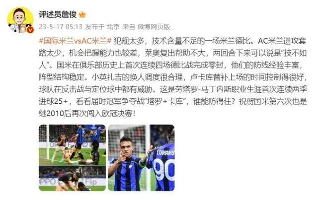 来源:JRS直播05-17 16:25925直播04月17日讯 3:00,欧冠半决赛次回合米兰德比,国米1-0战胜米兰,总比分3-0晋级决赛。赛后著名足球评述员詹俊发文评价了本场比赛:犯规太多,技术含量不足的一场米兰德比。