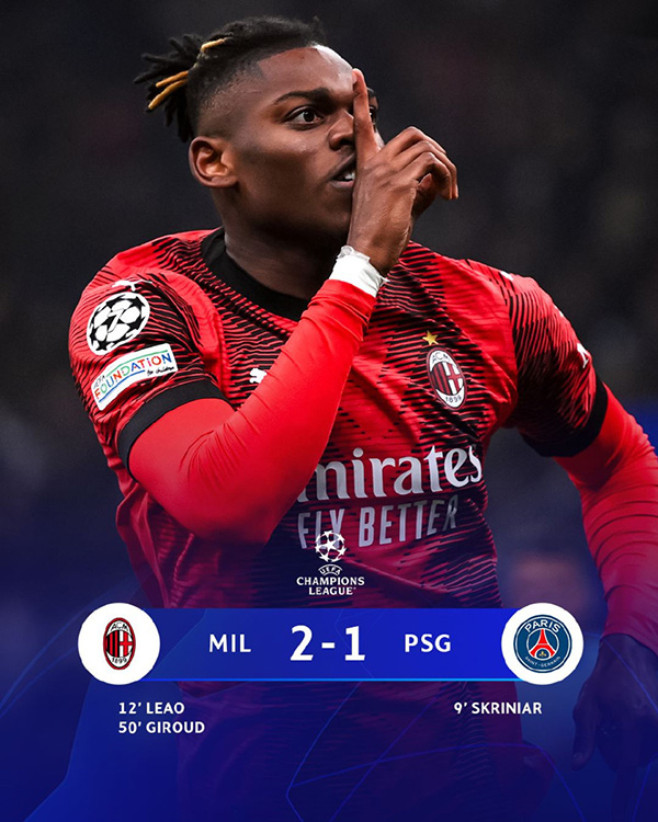 本场比赛前,米兰欧冠3轮后只积2分,已经被逼到了淘汰边缘。但此役回到圣西罗球场,红黑军团将士迸发了惊人的战斗力。在圣西罗主场球迷的助威声下,凭借莱奥和吉鲁这两大核心的进球,米兰成功逆转大巴黎。