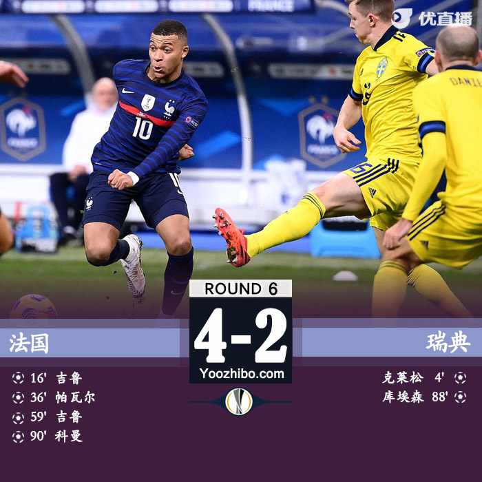 下半场补时4分钟,第94分钟,科曼反击推射空门,法国队4-2最终击败瑞典。