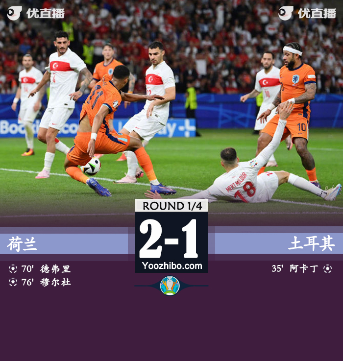 925直播讯 北京时间7月7日欧洲杯1/4决赛,荷兰对阵土耳其。上半场,居勒尔助攻阿卡丁头槌破门。易边再战,德佩失空门良机,居勒尔任意球中柱,德弗里头槌扳平,加克波造乌龙制胜。最终荷兰2-1土耳其晋级四强将战英格兰。