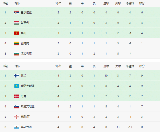 H组的芬兰开局4场比赛拿下9分,表现强势,哈萨克斯坦也是9分的状态,成为本届欧预赛至今的最大黑马,当然身后7分的丹麦和斯洛文尼亚也有机会。I组的格局是瑞士、罗马尼亚和以色列之间的竞争。J组的葡萄牙开局全胜,斯洛伐克也有不俗的表现。