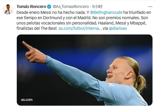 来源:JRS直播12-15 19:06925直播12月15日,知名皇马“喉舌”、《阿斯报》副主编龙赛罗,在个人社交账号上发文怒喷本年度世界足球先生的三甲人选。不出意外,龙赛罗将矛头直指阿根廷球王梅西,他直言梅西1月份之后的近1年时间啥都没做,根本不配入围前三名。