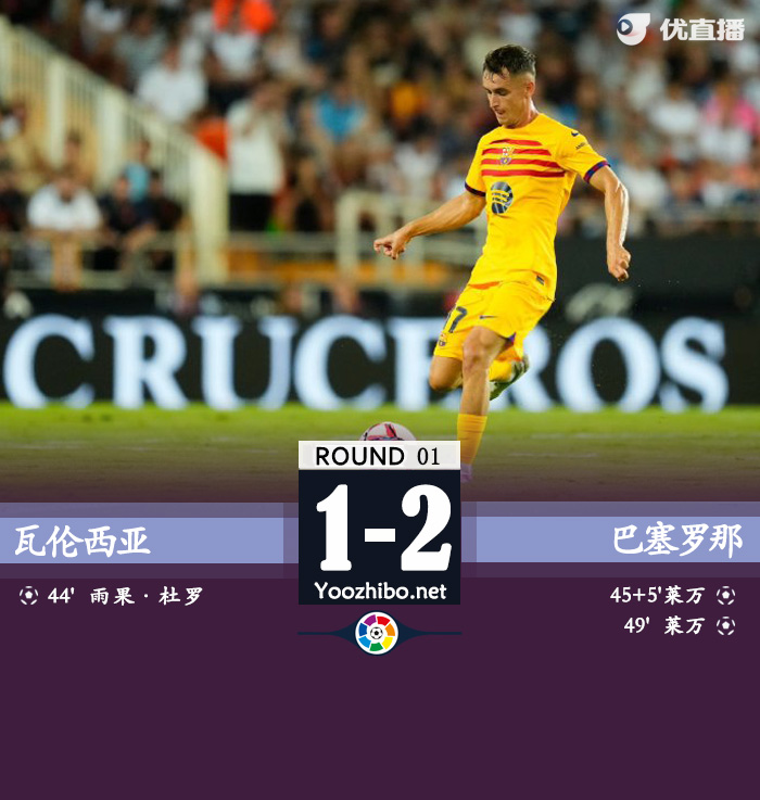 第44分钟,迭戈-洛佩斯左路连续虚晃后送出精准传中,无人盯防的杜罗头球顶反角入网,第一时间边裁举旗示意越位在先进球无效,VAR介入后判定进球有效!巴萨0-1瓦伦
