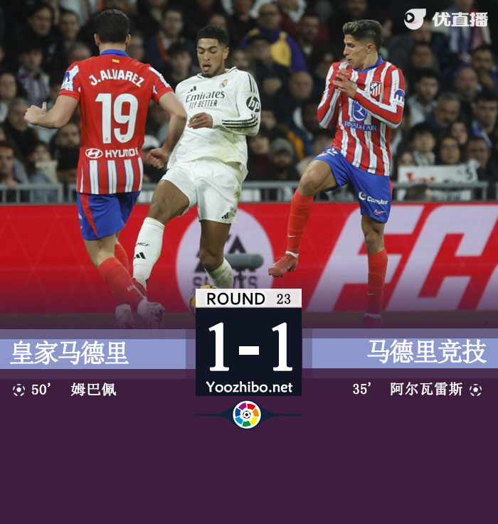 来源:JRS直播02-09 06:23 925直播讯 北京时间2月9日西班牙足球甲级联赛第23轮的较量中,皇家马德里坐镇主场迎战马德里竞技。上半场,楚阿梅尼踩倒利诺送点,阿尔瓦雷斯罚进勺子点球。下半场,贝林厄姆射门被挡出,姆巴佩补射扳平比分。随后,贝林厄姆冲顶击中横梁弹出。全场比赛结束,皇马1-1战平马竞,继续以1分优势领跑西甲。